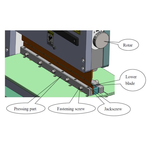 3. Using 5mm Allen key to loosen 5 screws, then adjust 6 jackscrews, adjust lower blade to the lowest point.